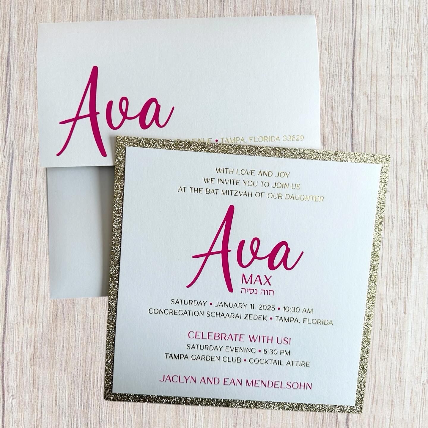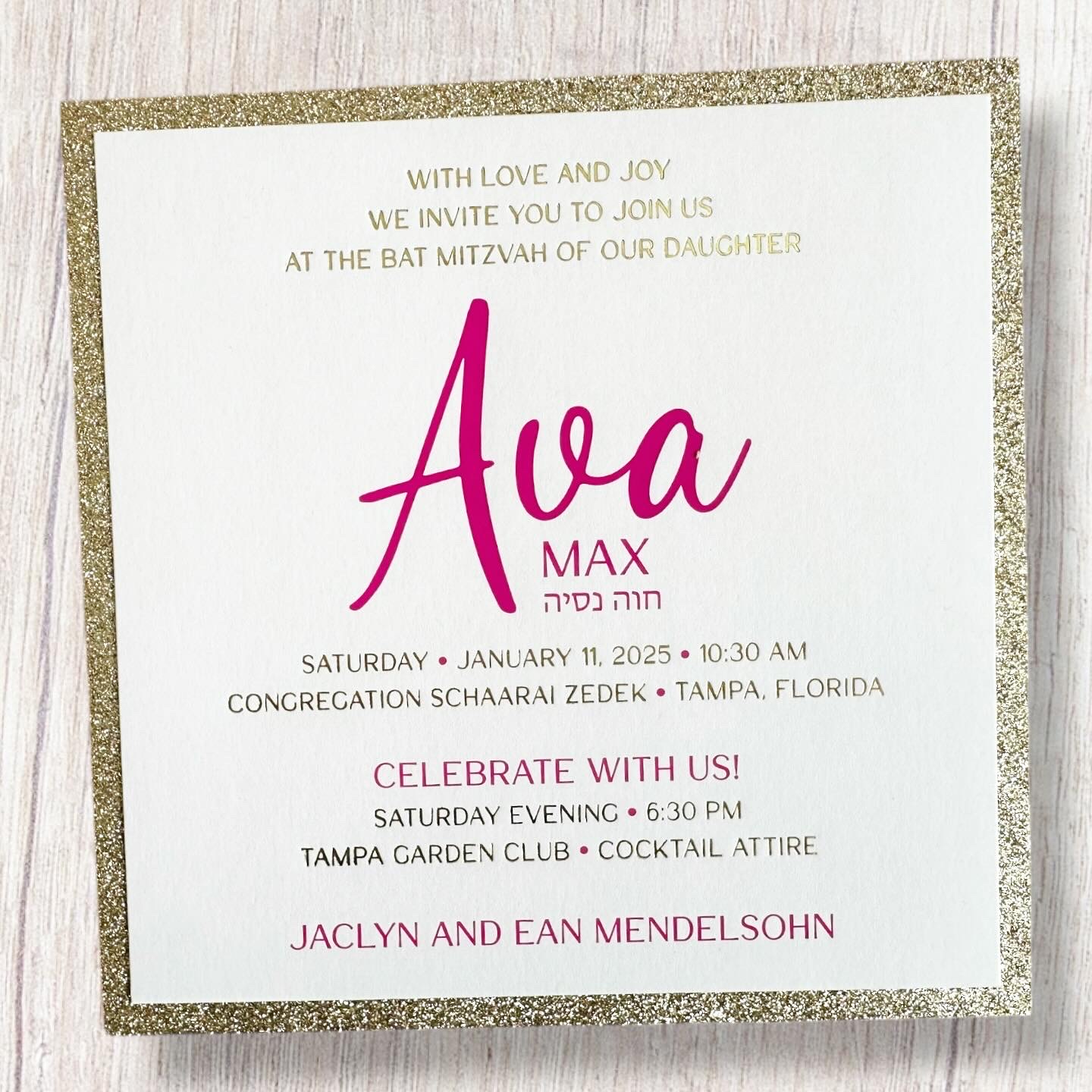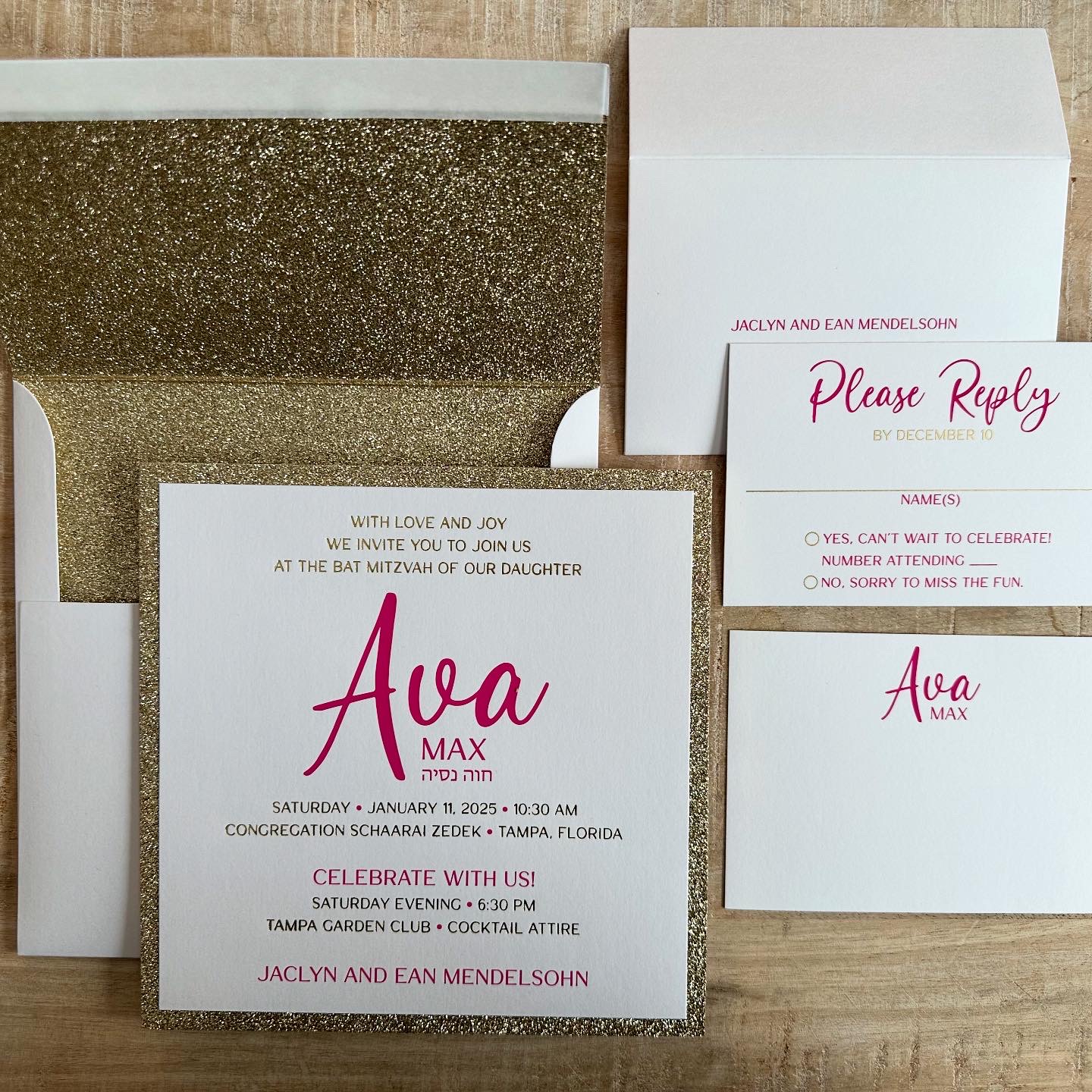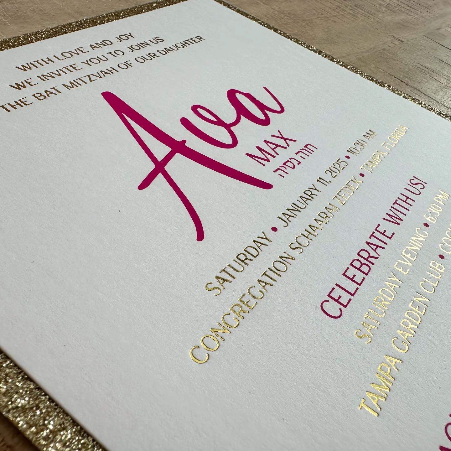 Gold glitter, gold foil printing, and gold foiled edges made this invites sparkle and shine!