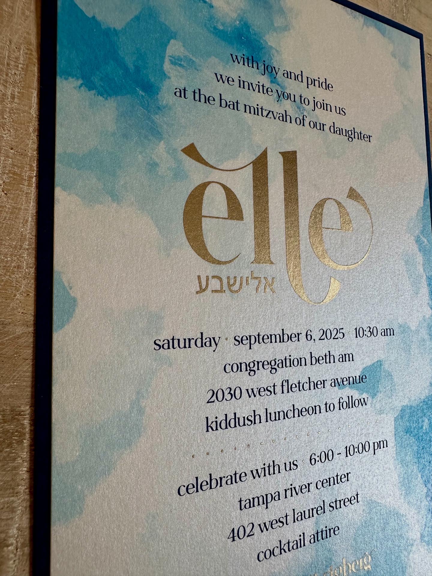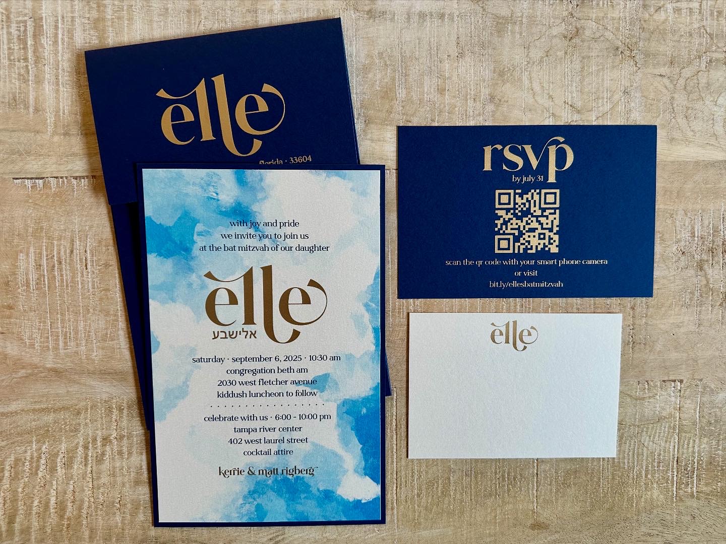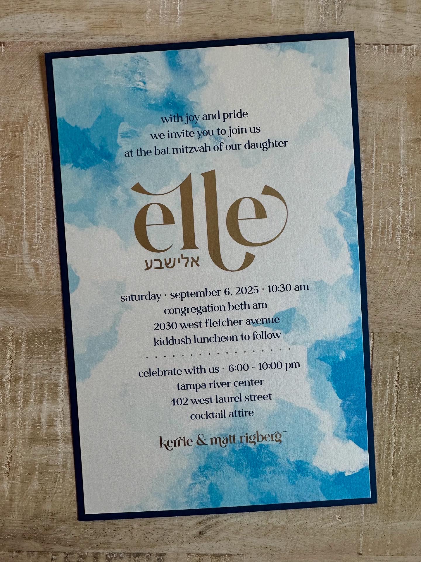 Blue watercolor, metallic gold, and cool fonts make this invite one of a kind!