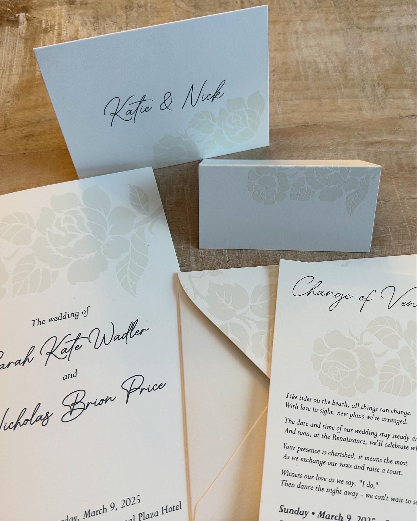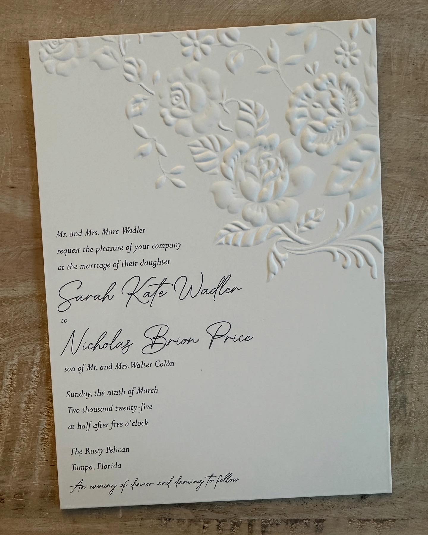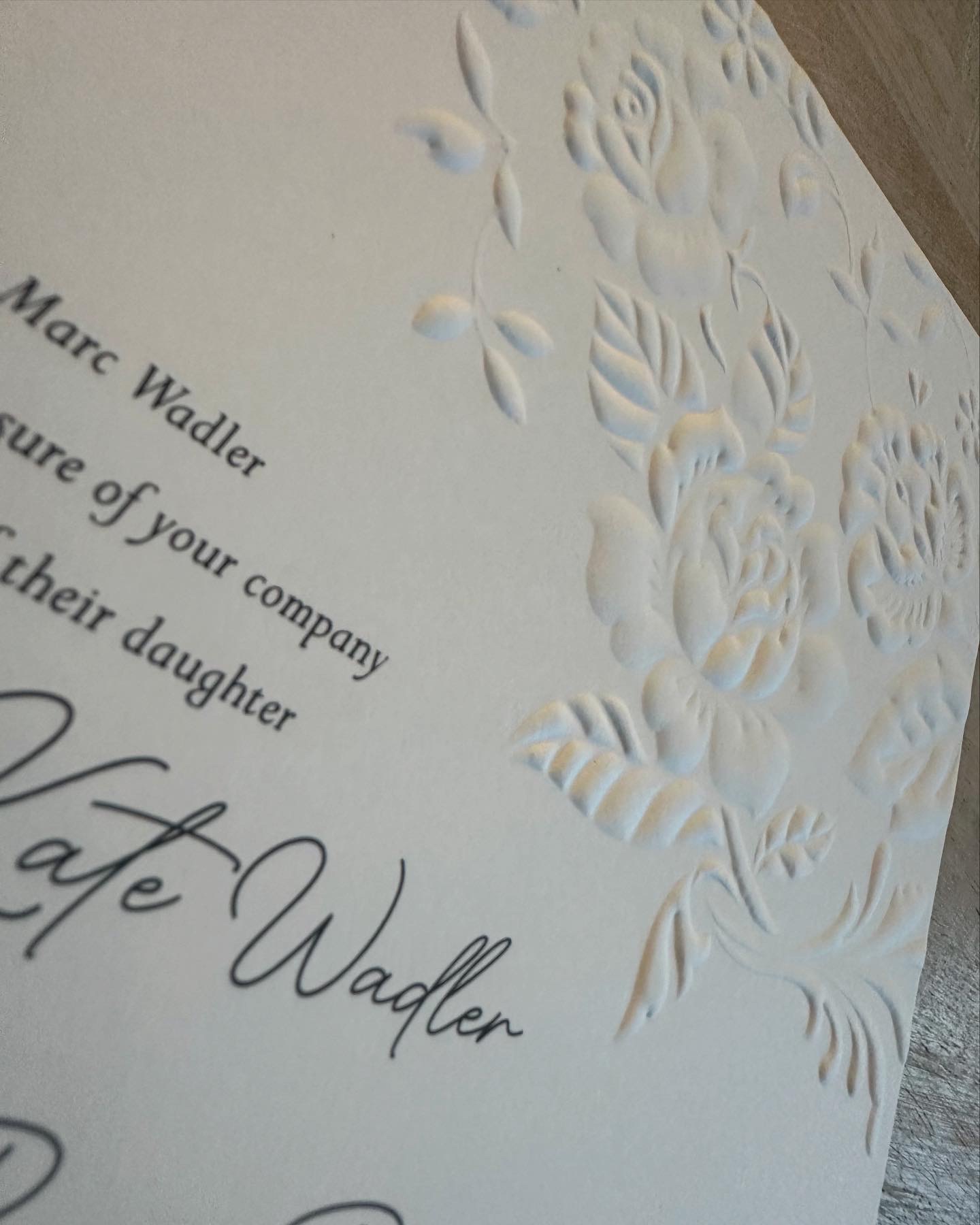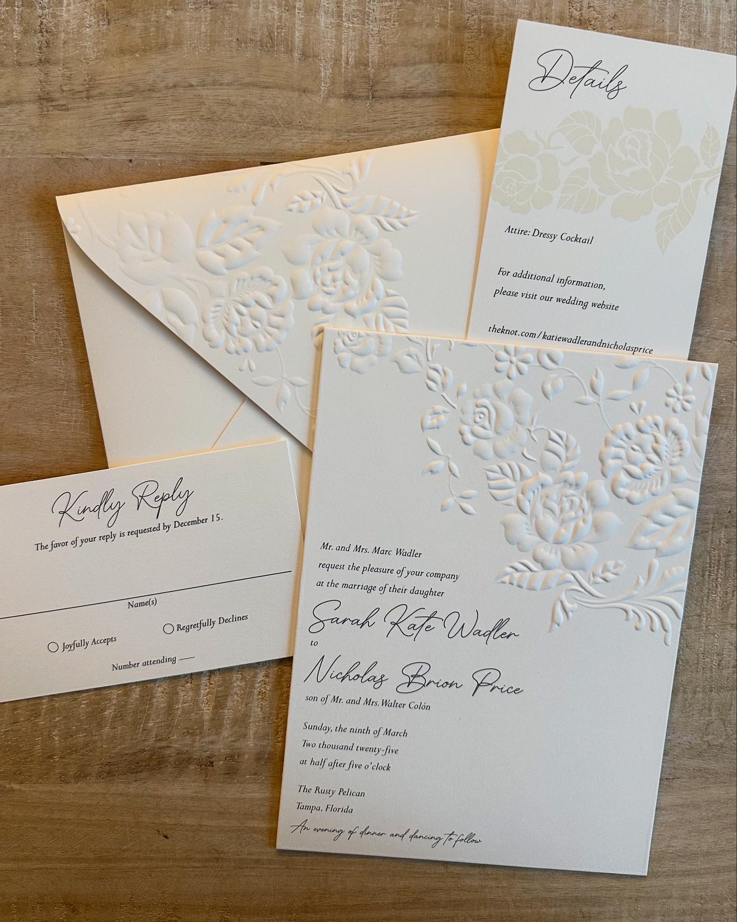 Floral embossed wedding invitations and coordinating accessories.