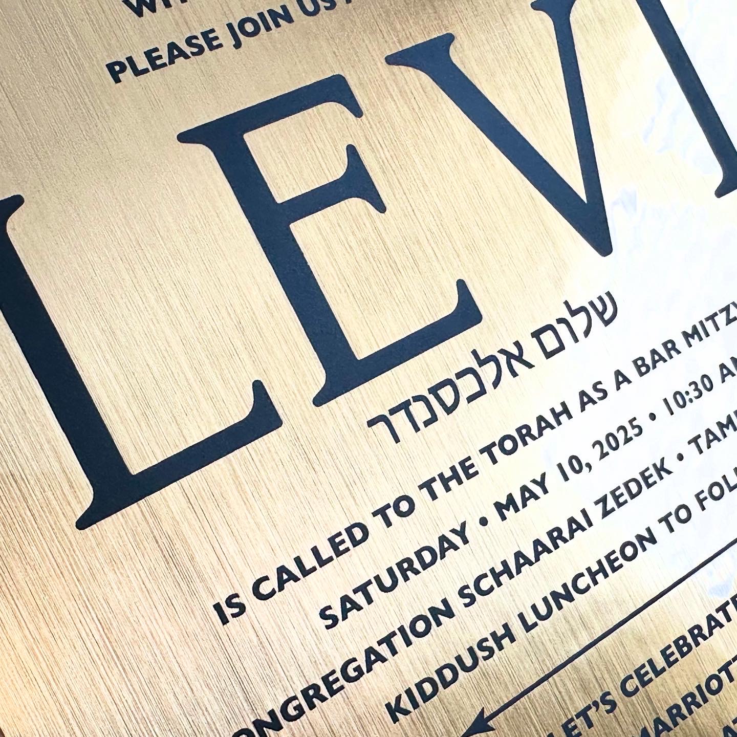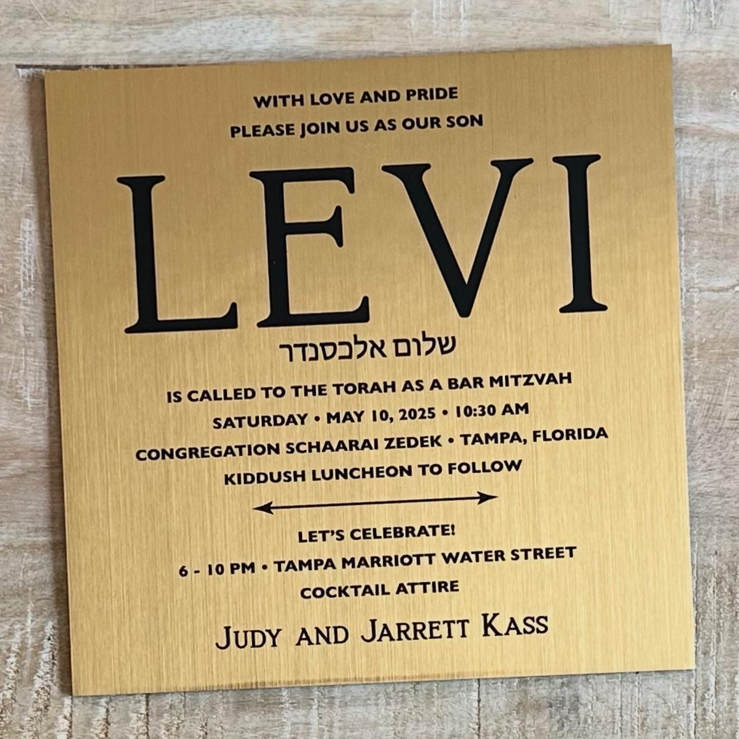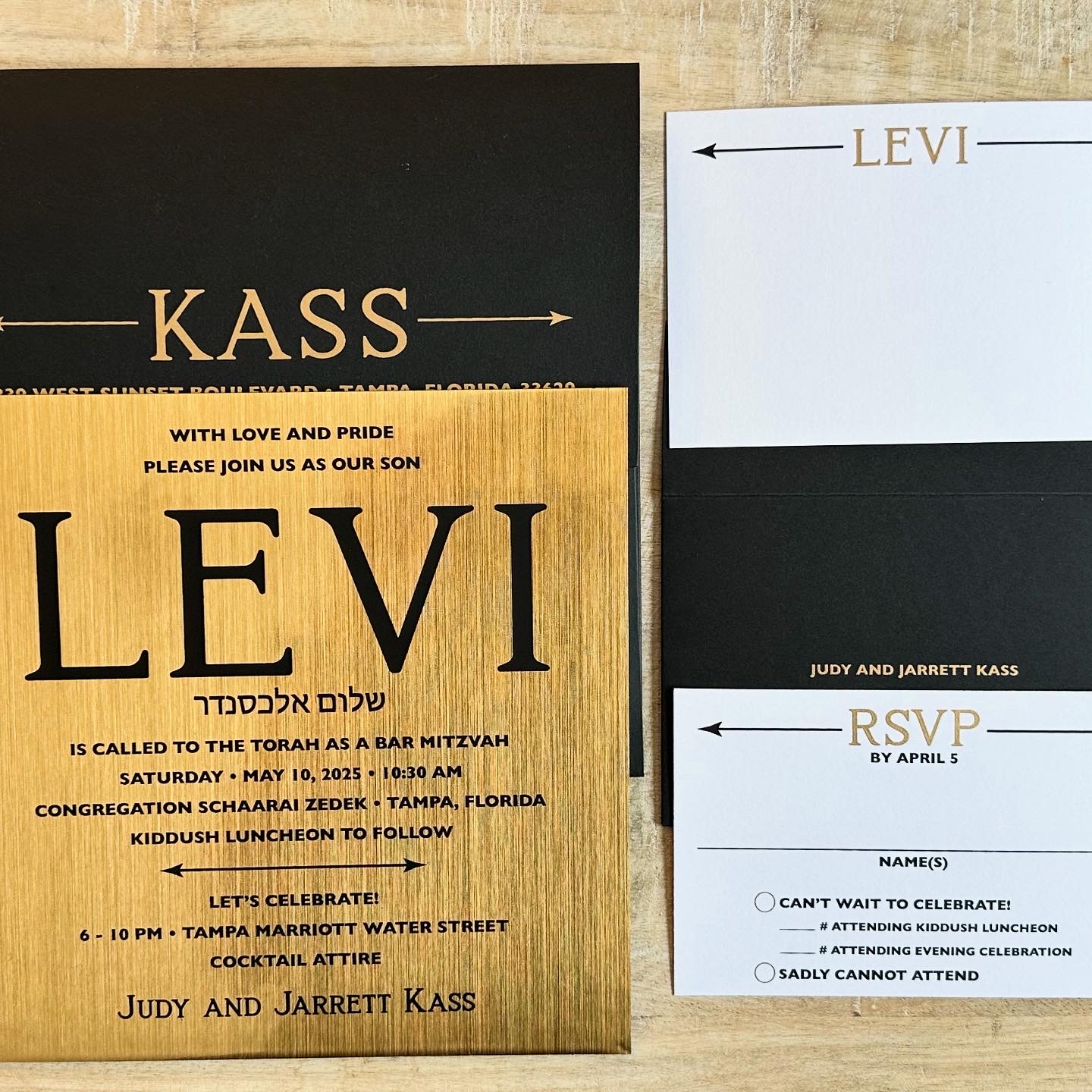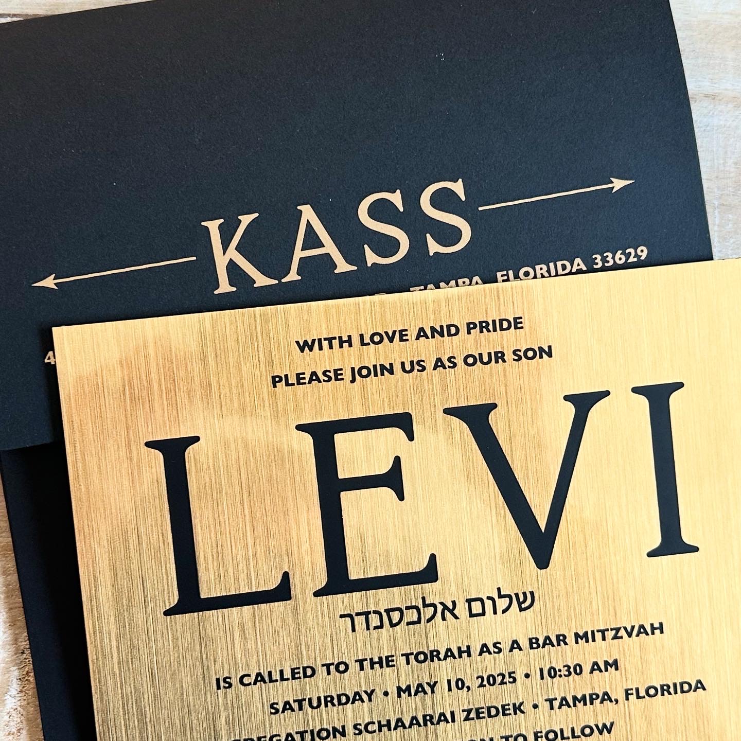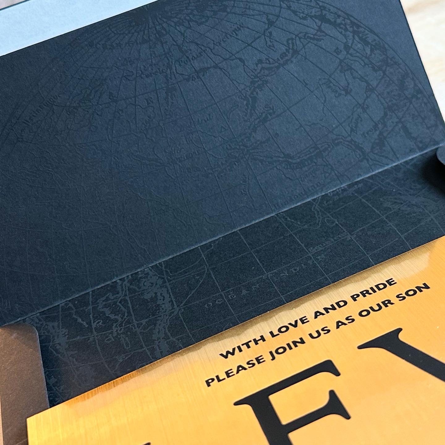 Brushed gold invite and a subtle tone-on-tone envelope liner made a statement.